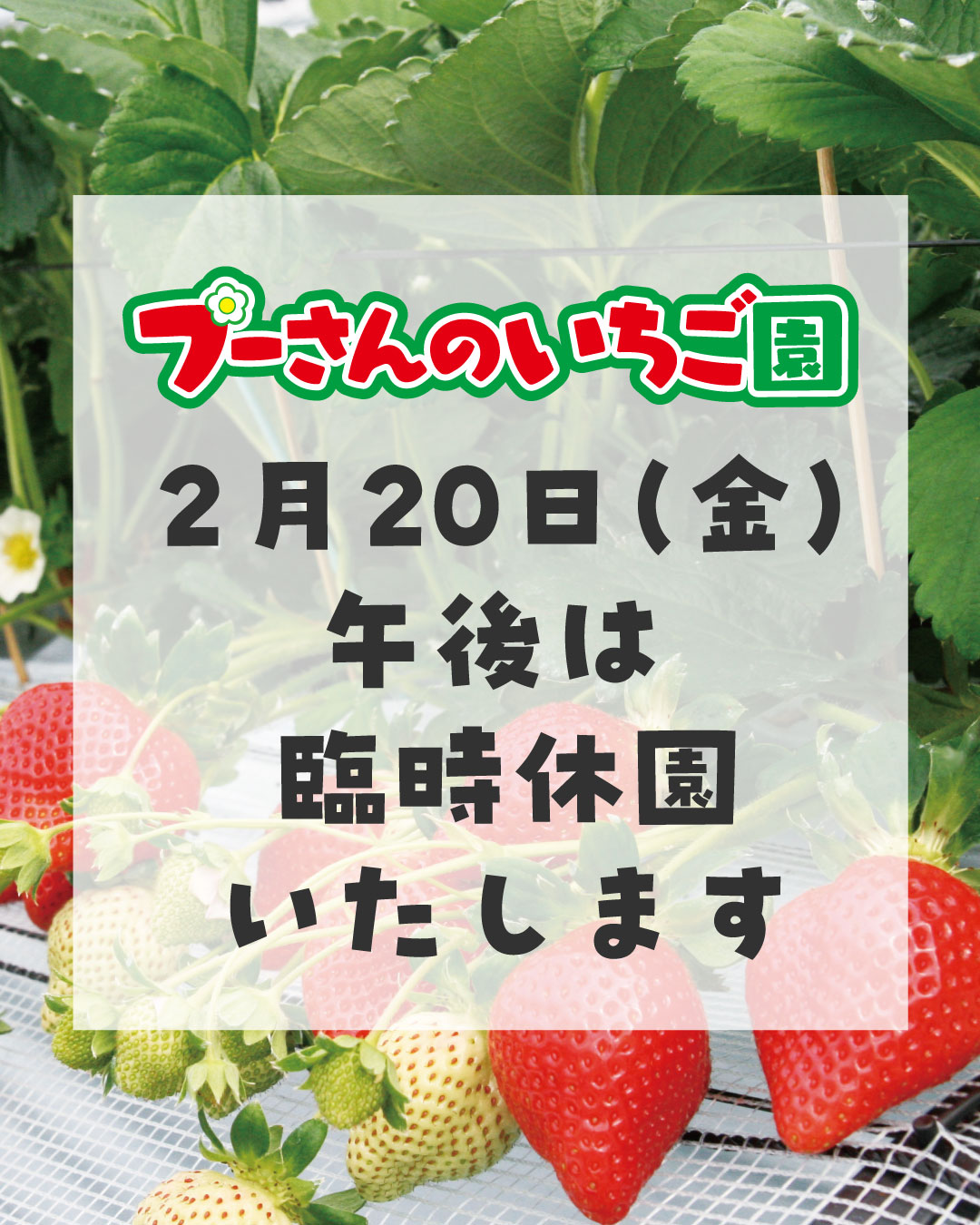 大変申し訳ございませんが、2/20(金)午後は臨時休園させていただきますので、よろしくお願いいたします。